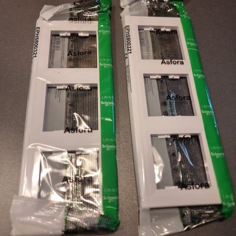 Schneider Electric Asfora 3-roms ramme horisontal i fargen antrasitt. Rammen er beregnet for tre innsatser montert ved siden av hverandre og brukes sammen med Asfora-serien av brytere og stikkontakter. Egnet for innendørs installasjon i standard veggbokser der Asfora-komponenter benyttes.