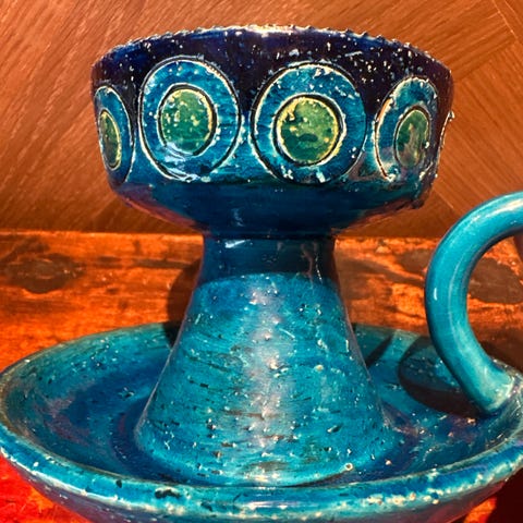 BITOSSI LYSESTAKE. Italiensk keramikk, 1960-tallet. Dekor "Rimini Blue" med glasur i turkise nyanser. Formgitt av Aldo Londi (1911-2003). Pent brukt stand.