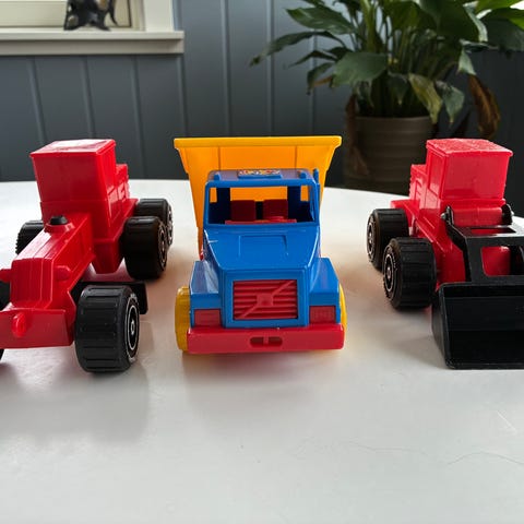 2 stk Plasto lastebil med dumperkasse og plog. 60 cm lang.