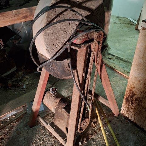 Elektrisk slipestein på metallstativ. Stor rund slipestein drevet av rem og hjul, med elektrisk motor montert under. Slipesteinen står i en balje/kasse som kan fylles med vann for våtsliping. Egnet til sliping og bryning av ulike typer verktøy og kniver i verksted .Strømtilkobling med jordet støpsel.
