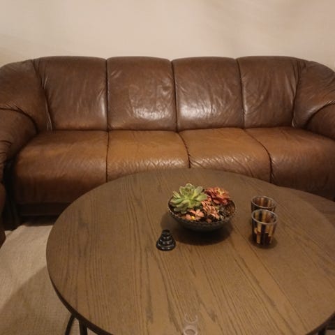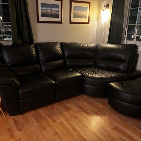 Pent brukt skinnsofa. Noen riper på den ene sitteputen ellers i bra stand. Stått i kjellerstue. Må hentes.