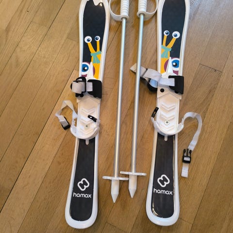Hamax Barneski med staver i hvit og svart farge. Skiene har integrerte plastbindinger med justerbare reimer som passer til vanlige vintersko. Design med fargerikt motiv på oversiden. Leveres som sett med to ski og to staver med plastgrep og trinser. Egnet for lek og enkel skigåing for barn.