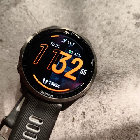 Garmin Forerunner smartklokke i svart. Klokken har rund urskive med digitalt display som viser blant annet puls, Body Battery, skritt og andre aktivitetsdata. Egnet til daglig bruk og trening, med funksjoner for aktivitetsmåling og varsling direkte på håndleddet.
