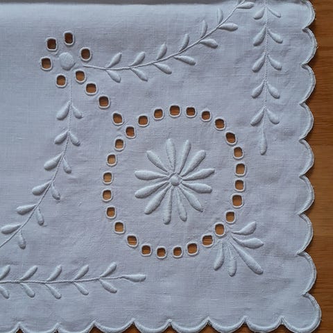 Engelsk søm, håndbrodert hvit duk.