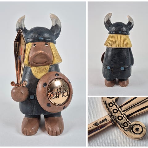 Charlotte Weibull laget Nils Holgersson dukke med gås på treplate. Dukken er kledd i tradisjonspreget drakt med brodert vest, hvit skjorte, mørke knebukser, hatt med fjær og tresko. Figuren står på en treplate med navnet «Nils Holgersson» inngravert. Ved siden av står en hvit gåsefigur. Under platen er det produsentmerke med teksten «Charlotte Weibull, Åkarp Sweden».
