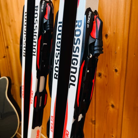 Rossignol Delta Comp skøyteski med binding. Skiene har klassisk racinginspirert design med overdel i hvitt, svart og rødt. Brukt svært lit (totalt 4 skiturer)