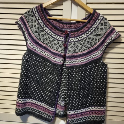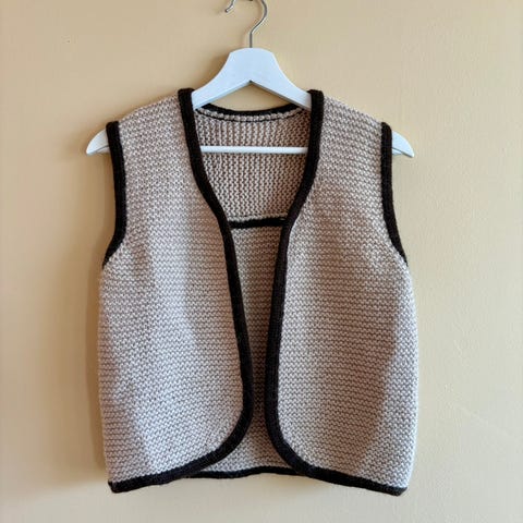 Behagelig causual comfy komfortabel kvalitet elegant stilfull rimelig mote merkeklær bærekraftig gjenbruk secondhand hjemmestrikket, håndlaget, ull, ullvest, strikkevest, heklet vest, crochet, granny square, granny ruter, retro, vintage stil, 70s vibe, boho, bohemsk, cottagecore, pastell, rosa og grå, unik, slow fashion, lag-på-lag, høst, vinter, vår, dame