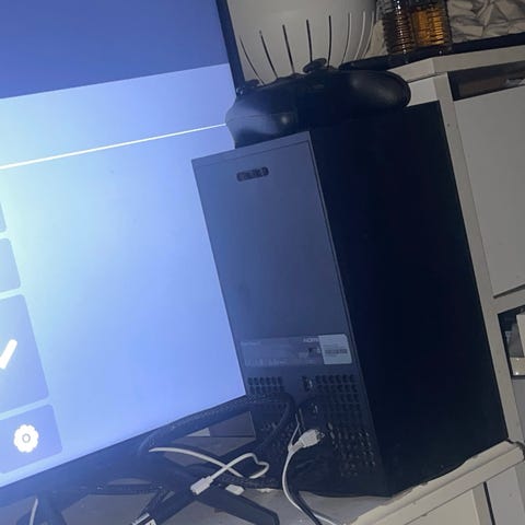 Selger pent brukt Microsoft Xbox Series X spillkonsoll i svart. Konsollen er av typen Xbox Series og leveres med trådløs kontroller. På bildene vises originalemballasje og et fysisk spill. Egnet for bruk med kompatible Xbox Series-spill og tilkobling til TV eller skjerm via HDMI. Støtter trådløse håndkontrollere.