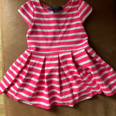 Polo Ralph Lauren kjole for jente i størrelse 92. Kjolen er laget av bomull og har flerfarget design med stripet overdel. Passer til hverdagsbruk eller enklere pyntede anledninger for små barn.