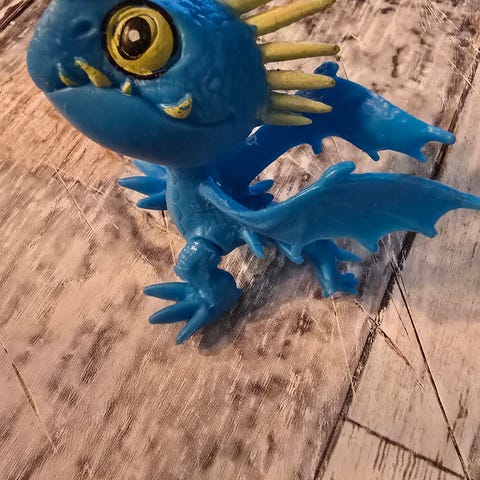 Plastleke formet som en drage i svart og rød farge med lyse horn og klør. Figuren har store vinger, lang hale og bevegelige vinger, bein og armer. Egnet som lekefigur for barn eller som samlefigur for drage- og fantasyinteresserte.