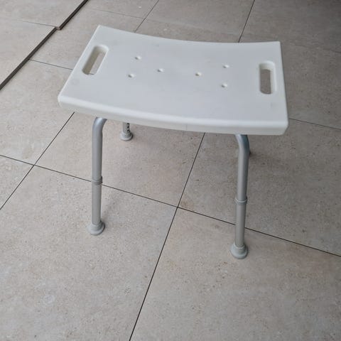 Rund dusjkrakk med justerbare ben i metall og sete i plast. Setet har dreneringshull for å lede bort vann. Benene kan høydejusteres ved hjelp av klikkfester, og har gummiknotter nederst for bedre stabilitet på vått underlag. Egnet for bruk på bad, for eksempel i dusj eller ved vask.