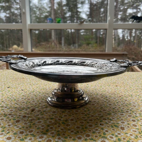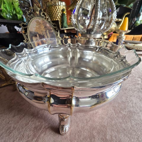 WMF jugend/art nouveau etasjefat med damefigur i metallfot og glassfat fra 1900 tallet.Foten er utformet som en stående kvinnefigur som holder fatet over hodet. Øvre del består av et rundt, klart glassfat med slipt/dekorert kant. Basen er dekorert med gjennombrutte detaljer. Egner seg som serveringsfat til kaker, frukt eller konfekt, eller som dekorativt midtpunkt på bord eller skjenk.
