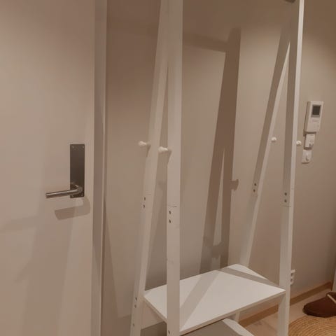 IKEA klesstativ i hvitlakkert metall. Stativet har en horisontal stang til oppheng av klær på kleshenger og en nedre hylle med ribber som kan brukes til oppbevaring av sko eller esker. Utstyrt med hjul for enkel flytting. Egner seg til bruk i gang, soverom eller bod for ekstra klesoppbevaring.