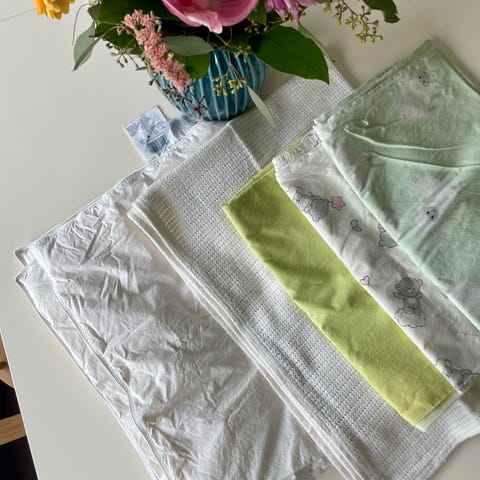 Pakke, med dyne, tepper, sengetøy osv til baby