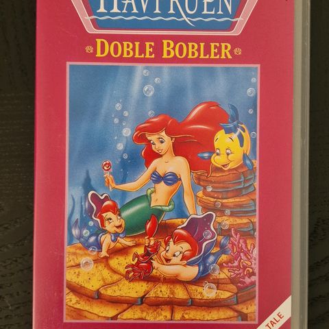 Disney Den lille havfruen Doble bobler VHS-film med norsk tale. Tegnefilm med Ariel og figurene fra universet til Den lille havfruen. Kassetten er i standard VHS-format med norsk språk og originalt omslagstekst på norsk. Passer for barn og familier som ønsker å se en kortfilm/spesialepisode fra Den lille havfruen-serien på VHS.