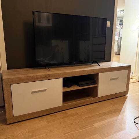 Selger en stilren og solid TV-benk i hvitpigmentert eik. Benken er ca. et par år gammel og fremstår som svært pen, uten synlige skader.