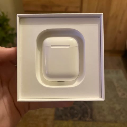 Apple AirPods trådløse ørepropper i hvit farge med ladeetui. Øreproppene kobles trådløst til kompatible enheter via Bluetooth og oppbevares i det medfølgende etuiet når de ikke er i bruk. Ladeetuiet fungerer også som powerbank for øreproppene og har indikatorlys på fronten. Egner seg til bruk med Apple-enheter og andre enheter som støtter Bluetooth-tilkobling. Jeg kjøpte de for cirka 1,5 år siden og selger fordi jeg ikke bruker de så mye. Er fortsatt i god stand og lyden funker bra.