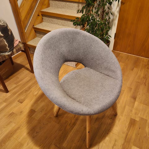 Stol i polstret utførelse. Stolen har grå tekstiltrekk og skråstilte ben. Åpen rygg og rund form gir en omsluttende sitteflate. Egnet som ekstra stol i stue, soverom, gang eller ute.