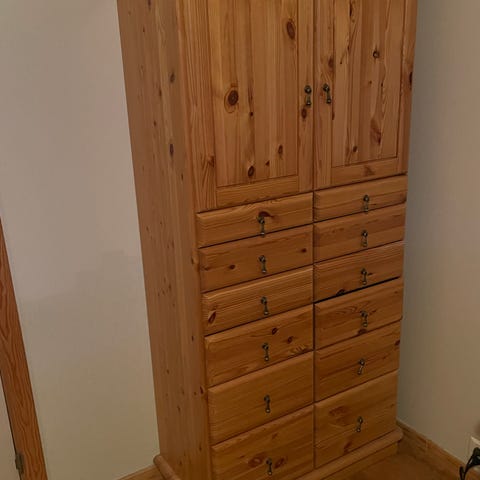 Praktisk skap med skapdør på venstre side og flere skuffer på høyre. Tre hyller som kan justeres som ønsket. Står stødig og fungerer uten problemer. Relativt lett å bære.