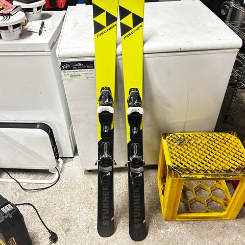 Fischer alpinski med Look-bindinger. Skiene har klassisk utforming med lys/hvit farge og stripemønster. Bindingene er av typen Look med justerbar innstilling. Egnet til vanlig alpinkjøring. Lengde, radius og mål er ikke oppgitt og bør eventuelt måles ved interesse.