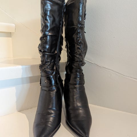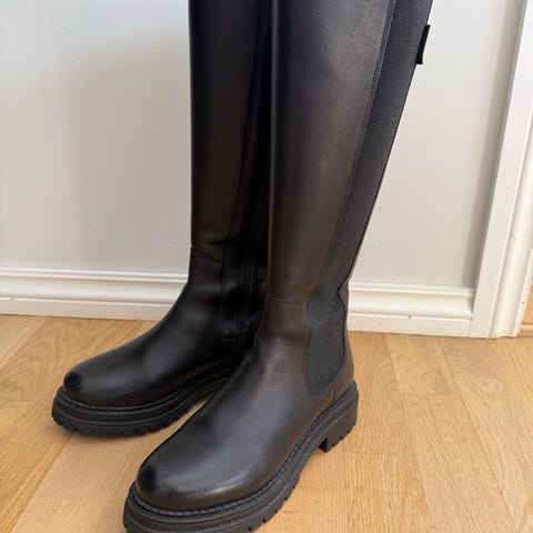 H&M støvler i størrelse 40. Høye, svarte støvler i minimal stil. Reimen på toppen er tatt av of mistet. Glatt overflate. Passer til bruk i hverdagen, praktiske mtp regn, passer til ulike antrekk både med tights eller skinny jeans. Også fine med kjoler og skjørt. Pent brukt, masse bruk igjen.