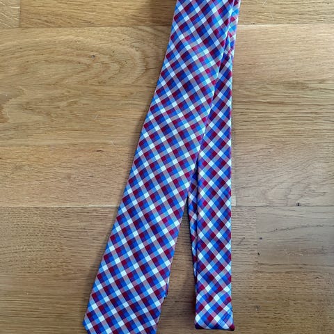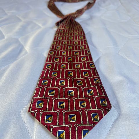 Tommy Bahama slips for herre i 100 % silke. Slips i rødfarge med palmemønster og diagonale striper i kontrastfarger.