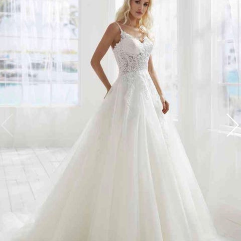 Helt ny og ubrukt. Ble kjøpt inn til bryllup som ble planlagt på kort tid, men pga graviditet valgte vi å utsette datoen så nå har jeg rekket å finne drømmekjolen istede. Passer en L-XL og kan ifølge skredder sys både inn og opp, jeg er 172 å det var enda en del å gå på så den kan fint tilpasses eller passe høyere. Hadde opprinnelig tenkt å få den tilpasset 100% hos skredder men kom aldri lengre enn at en skredder så på den. God kvalitet til veldig billig pris, det har skredder å sakt.