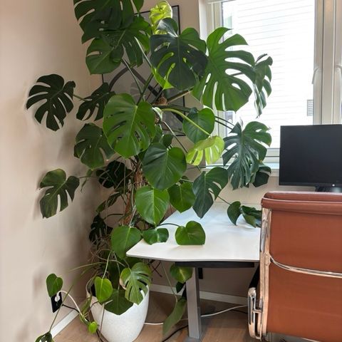Høy monstera selges grunnen plass mangel. Med potte er ca 165 cm høy +. Står ikke stabilt, må støttes. Må hentes.
