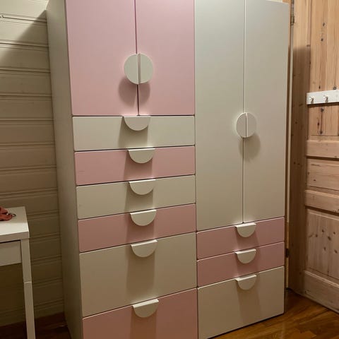 Rosa passer ikke helt lenger for eldstejenta.... Garderobe bestående av skap og skuff seksjoner kjøpt på IKEA selges. Noen bruksmerker finnes det jo, men det er helt og ganske pent.