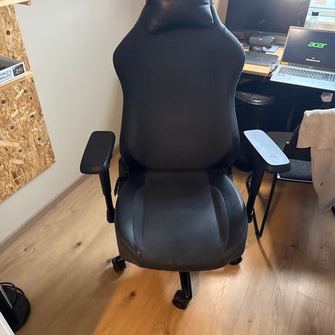 Pulten er pent brukt og klar for ny gamer. Toppfilt har blitt borte i flytting men det følger med et sort, rundt underlag til gamingstol som tar vare på gulvene.