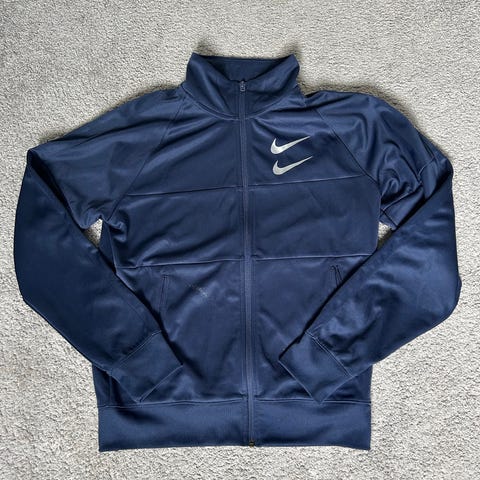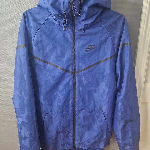 Nike treningsjakke i unisex størrelse S. Jakken har glidelås i full lengde foran og er flerfarget med hvit overdel, røde partier og lyseblå ermer. Modellen har høy krage og to lommer foran med glidelås. Egnet til trening og annen fysisk aktivitet, eller som lett ytterlag i hverdagen.