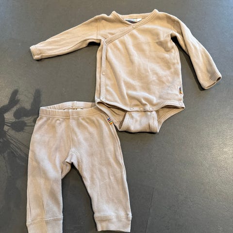 Pakke med hvit body fra HM og en digg bukse med print på rompa i vaflet bomull fra Newbie. Bodyen er brukt en gang, buksa er aldri brukt, kun vasket.