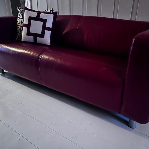 Vinrød 3-seter med to stoler selges. De er nette og veldig gode å sitte i.