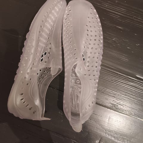 Sports vann-/svømmesko eller treningssko for de som liker å gå barbeint i størrelse 40. Skoene er svarte med flerfarget yttersåle og elastisk snøring med stramming. Overdelen ser ut til å være i pustende mesh-materiale med syntetiske forsterkninger. Sålen er tynn og fleksibel med mønster for grep på våte underlag. Egnet til svømming, badestrender, vannsport og andre aktiviteter der det er behov for lette sko som tørker raskt og beskytter føttene mot underlaget.