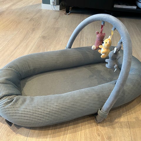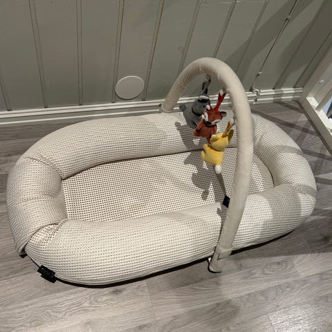 Babynest med myggnett og små leker. Babynestet har myke, polstrede kanter og en liggedel i lys tekstil. Myggnettet kan trekkes over for å skjerme barnet mot insekter.