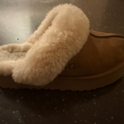 UGG tøfler i størrelse 40. Modellen er en åpen hæltøffel med brun utside og lys, myk innside.