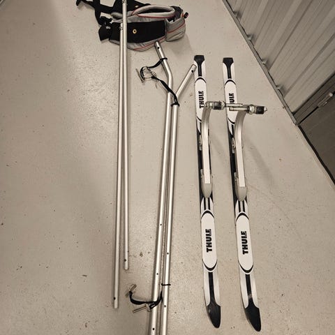 Thule skisett med ski og sele som er kompatibel med Thule vogner.