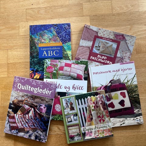Samling med bøker om quilting og lappeteknikk. Inneholder blant annet bøker med klassiske quiltmønstre, paper-pieced quiltblokker, art quilting med trinnvise illustrasjoner og en norsk bok om lappeteknikk. Bøkene dekker ulike teknikker, blokkdesign, mønstre og dekorative metoder for quilting og patchwork, egnet som referanse og inspirasjon for arbeid med tepper, veggtepper og andre tekstilprosjekter.