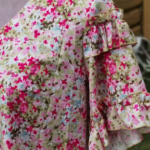 Ganni sommerkjole for dame i størrelse S. Kjolen er flerfarget med blomstermønster og dekorative detaljer foran, inkludert sløyfer og transparent partiet øverst. Materialet er polyester. Ermene er lange, og kjolen har en løs og rett fasong som passer til bruk vår og sommer. Passer til hverdagsbruk eller mer pyntede anledninger.