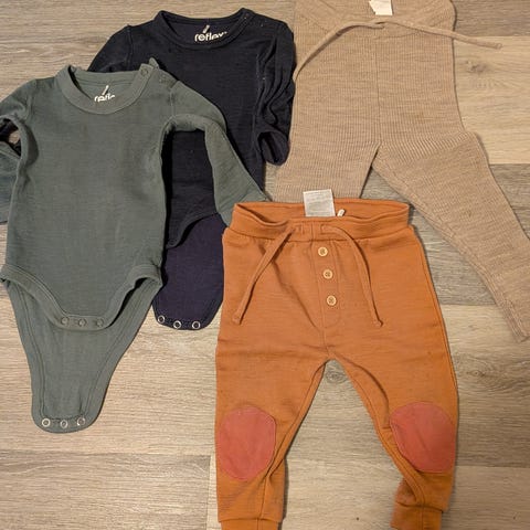 Pakke med to ullbodyer, to ullbukser og én ullpysj. Alt er pent brukt og kan kombineres fra 9-18 mnd.