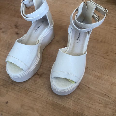 Nelly hæler i størrelse 36. Skoene har åpen tå og kraftig blokkhæl med platåsåle. Fargen fremstår som lys/kremhvit. Overdelen er i syntetisk materiale med justerbar ankelreim. Passer til bruk ved ulike anledninger der man ønsker et par lyse hæler med stabil hæl og platå.