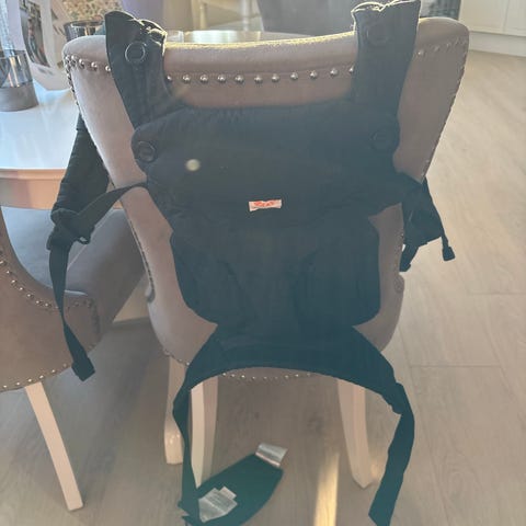 Ergobaby bæresel i svart med beige hette. Bæreselen har polstrede skulderstropper og hoftebelte med justerbare spenner for tilpasning til den som bærer. Hetten kan brukes som støtte til barnets hode eller som sol- og vindbeskyttelse. Egnet til å bære barn tett inntil kroppen, avlastning fordelt mellom skuldre og hofter. Passer både til mor og far, og kan brukes innendørs og utendørs i hverdagen eller på tur.