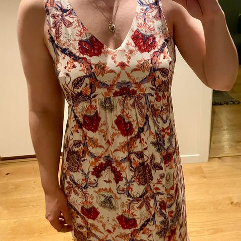 Detaljer: Kjolen har løse ermer i 3/4 lengde med rynkedetaljer og et knytebånd i halsen.