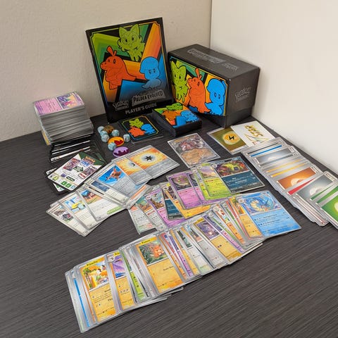 Pokémon samling av kortspill med ulike motiver og typer, inkludert energikort, karakterkort og angrepskort. Kortene varierer i farge, design og funksjon, og kan brukes til spill og samling.