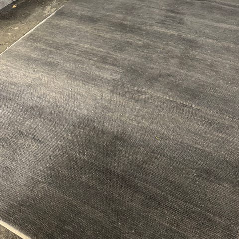 Teppet er av 100% lin og en grå fargetone som endrer litt farge/uttrykk ettersom hvordan lyset treffer teppet.