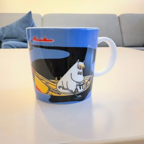 Arabia Mummi kopp med rosa bakgrunn og Mummi-motiv. Koppen er laget i porselen og har hank.