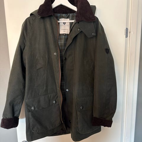Sollbury wax bomull. Tåler vind og noe regn. Str er en litt romslig S. i Jakken er grønn/ brun. Med to store lommer + to stikklommer. Den har hette og rutete fòr på innsiden. Fløyels krage