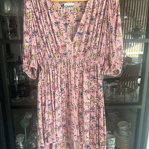 Ganni sommerkjole i bomull for dame i størrelse S. Kjolen har kort lengde og er laget i et lett bomullsstoff med flerfarget blomsterprint på lys bunn. Den har korte puffermarmer, rund utringning med snøring foran og rynkedetaljer langs hele for- og baksiden som gir en figurnær passform. Passer som sommerkjole til hverdagsbruk eller enkle anledninger. Kjolen har noe stretch som gjør at den passer en XS-s-m. Selges romlig da den ikke blir brukt nok