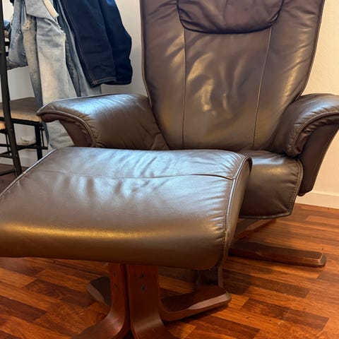 Selger en komfortabel og solid lenestol fra kvalitetsmerket Hjort Knudsen. Stolen har mykt brunt skinn, god sittekomfort og praktisk svingfot som gjør den perfekt til stue, lesekrok eller TV-hjørne.
