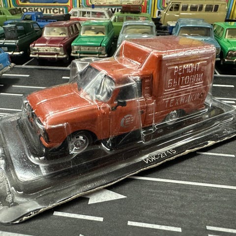 Modellbil som forestiller en oransje stasjonsvogn. Bilen står i gjennomsiktig plastemballasje på en sort base. Rundt modellen ses flere andre modellbiler, noe som kan tyde på at den passer inn i en samling. Egnet som samleobjekt eller utstillingsmodell. Nøyaktig målestokk, merke og modellbetegnelse er ikke oppgitt.